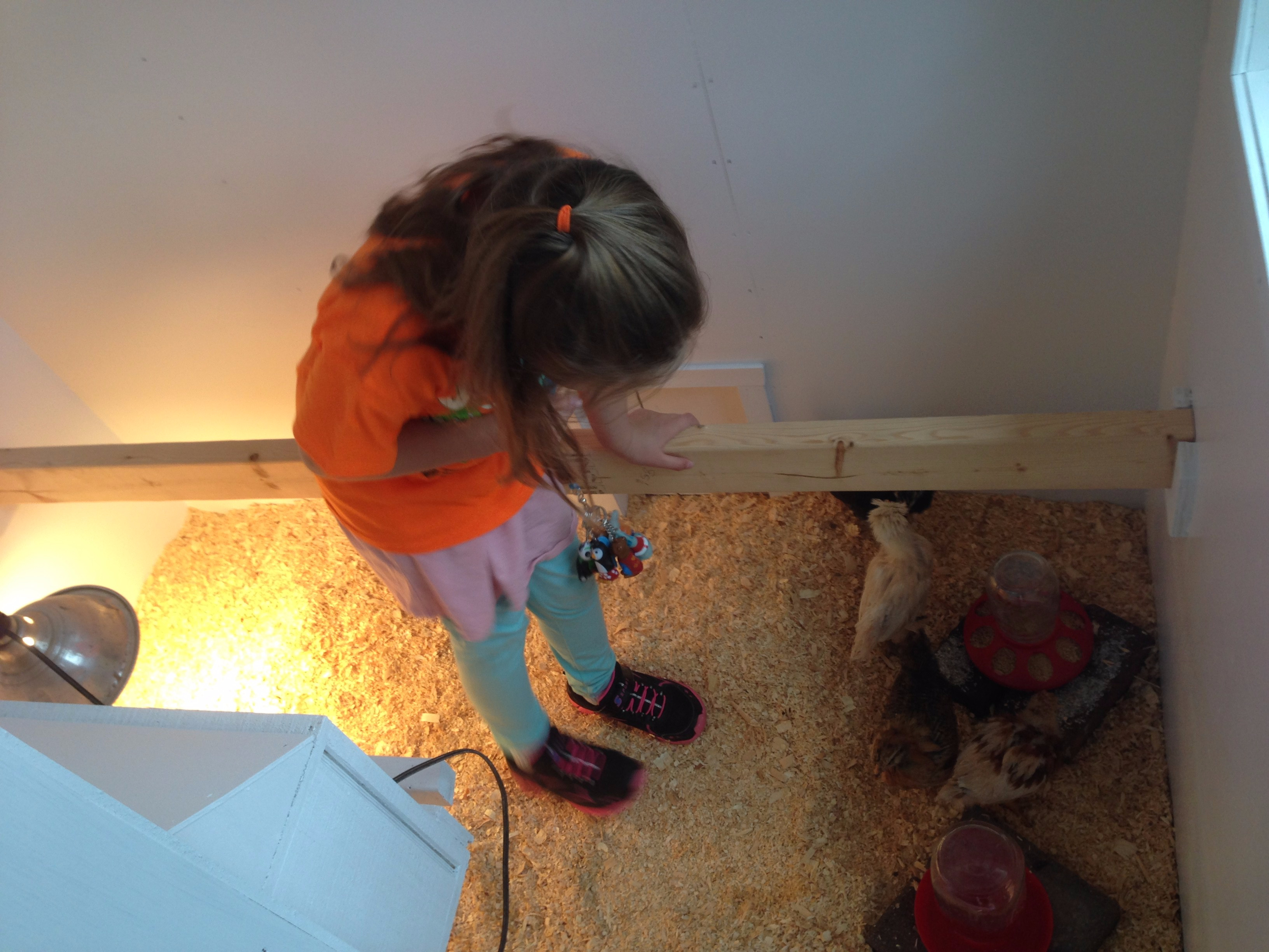 They stayed in a toasty room in our house for a few weeks… starting to get their real feathers and imprinting on the dear child. She is 100% their mother now. They did a great job eating chick starter, but loved treats like grass, peas, and spaghetti. The spaghetti party got wild with yelling, running, and literally tug of warring over noodles.